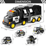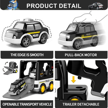 Bring the excitement of law enforcement to life with this detailed police truck playset! The friction-powered carrier truck can transport multiple vehicles at once, and the detachable trailer and rotating truck head add extra versatility. Whether it's chasing down bad guys, directing traffic, or performing daring rescues, this set lets kids create their own action-packed police missions.