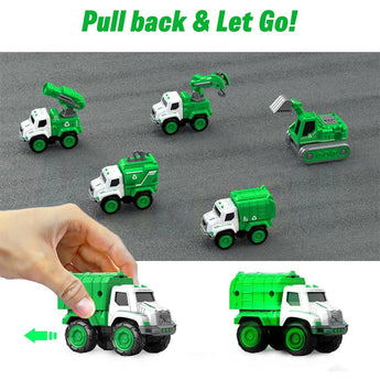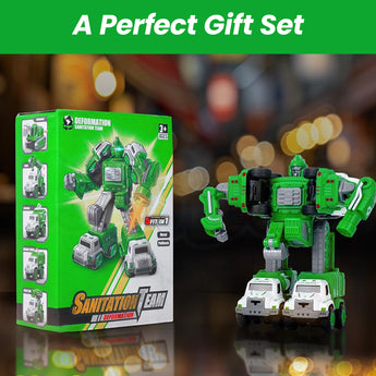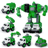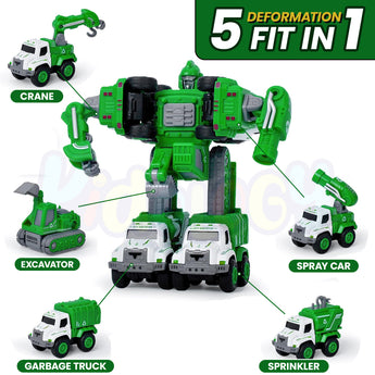 Includes Excavator, Crane, Sprinkler Truck, Garbage Truck & Spray Car – each transforms into a robot for immersive play.