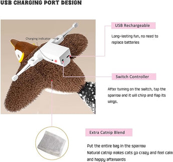 Bring playtime to life with this Rechargeable Flapping Bird Cat Toy — a realistic, chirping bird that flaps its wings to keep your cat entertained and active. Designed to mimic real birds, this smart toy responds to touch and motion, making it irresistible for your feline friend.