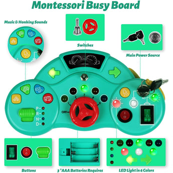 The Montessori Busy Board Switch LED Light Game is a multi-functional sensory toy designed to captivate toddlers with a world of light, sound, and hands-on exploration. Each button triggers vibrant LED lights and realistic car sounds like police sirens, fire trucks, ambulances, and car horns, providing endless entertainment and fostering sensory development.