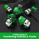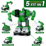 Includes Excavator, Crane, Sprinkler Truck, Garbage Truck & Spray Car – each transforms into a robot for immersive play.