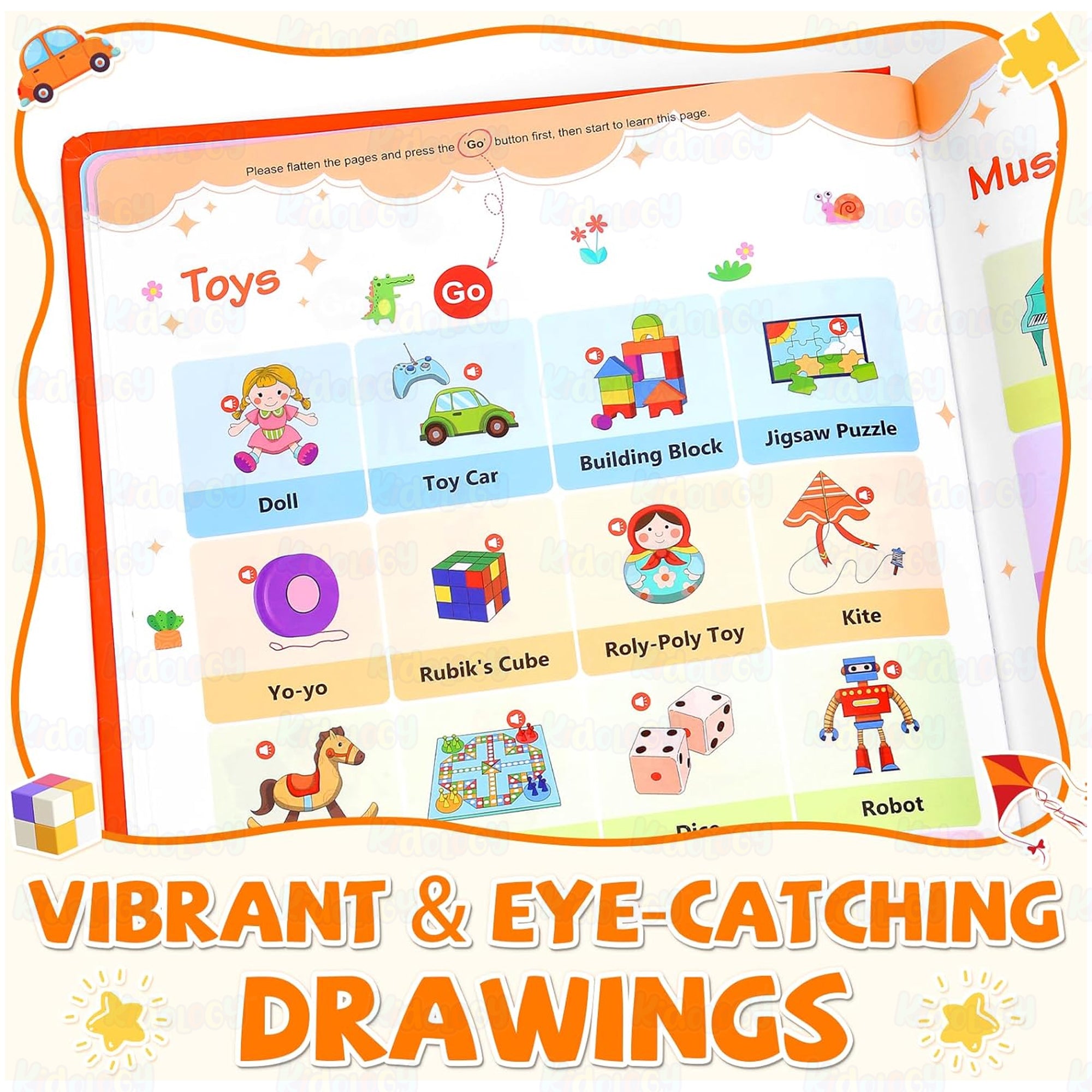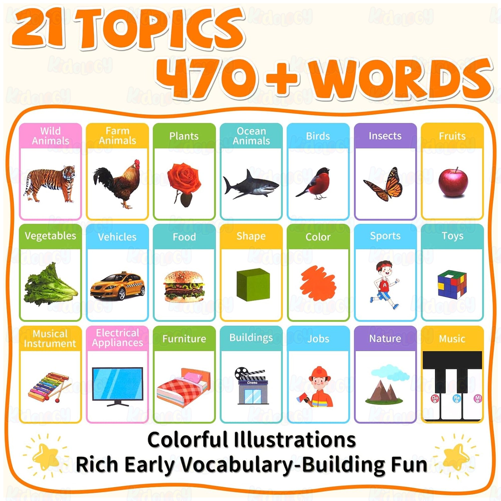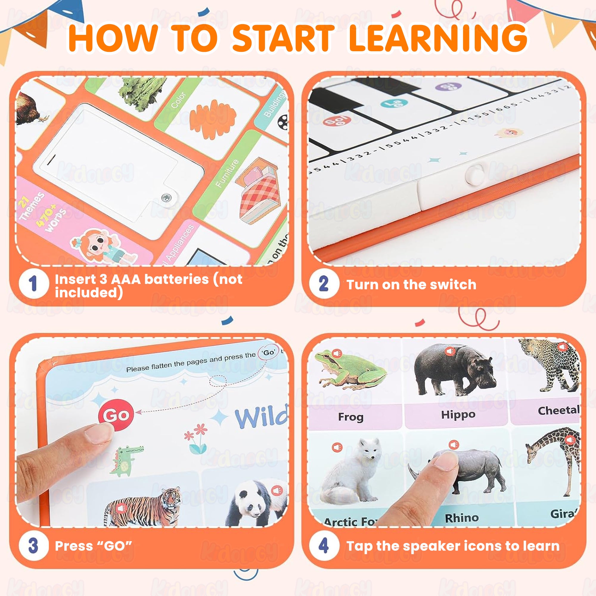 Simply press the sound buttons, listen to the pronunciation, repeat the words, and explore different themes like animals, food, colors, and more. Kids learn naturally through repetition and play!