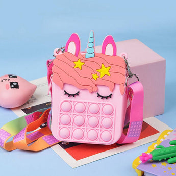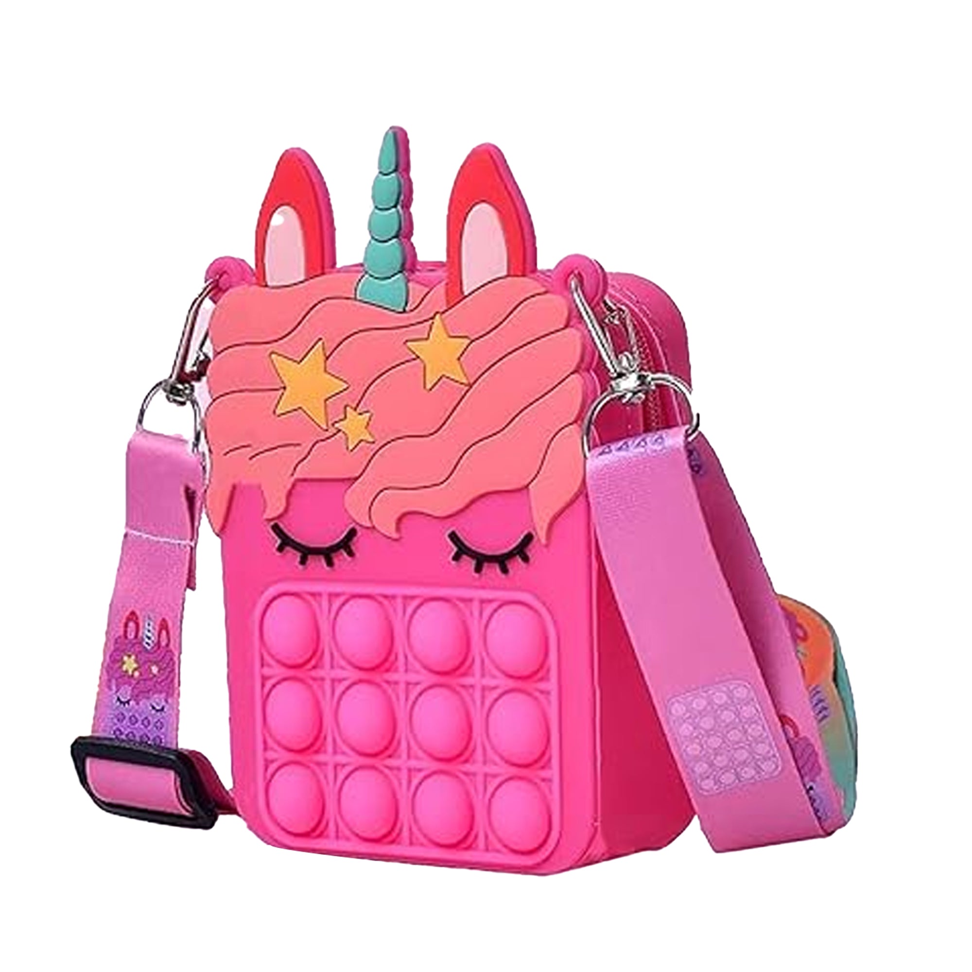 A cute unicorn sling bag with a built-in pop-it fidget toy that kids will love! This lightweight silicone bag lets children carry their small essentials while enjoying the satisfying pop of bubbles for fun and stress relief. Perfect for outings, playdates, and daily adventures π¦π