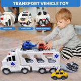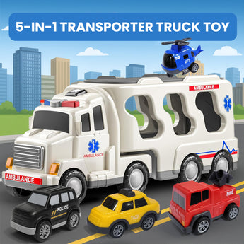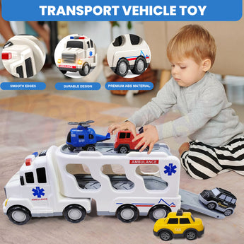 Let your little one race to the rescue with the 5 in 1 Ambulance Truck Toy Set! Specially designed for toddlers who dream of becoming heroes, this vibrant playset includes one large ambulance carrier truck and four miniature emergency rescue vehicles, including a helicopter! With flashing lights, realistic sirens, and interactive features, this toy inspires imaginative play while improving motor skills. Safe, durable, and perfect for boys and girls aged 3+, this medical rescue set is a must-have addition to any playroom.