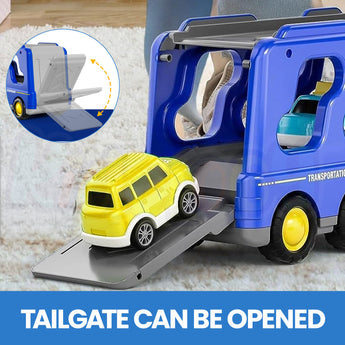 🌀 Friction-Powered Movement – No batteries needed! Just pull the vehicles backward or push the truck forward and watch them zoom. Tailgate opens for easy loading and unloading.