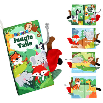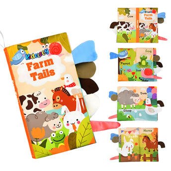 - 3 x Learning Tails Cloth Book with vibrant crinkle tails and ocean, farm, and jungle-themed illustrations.