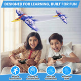 Charge the plane, switch it on, pair with the remote, and gently control lift-off, flight, and landing.
