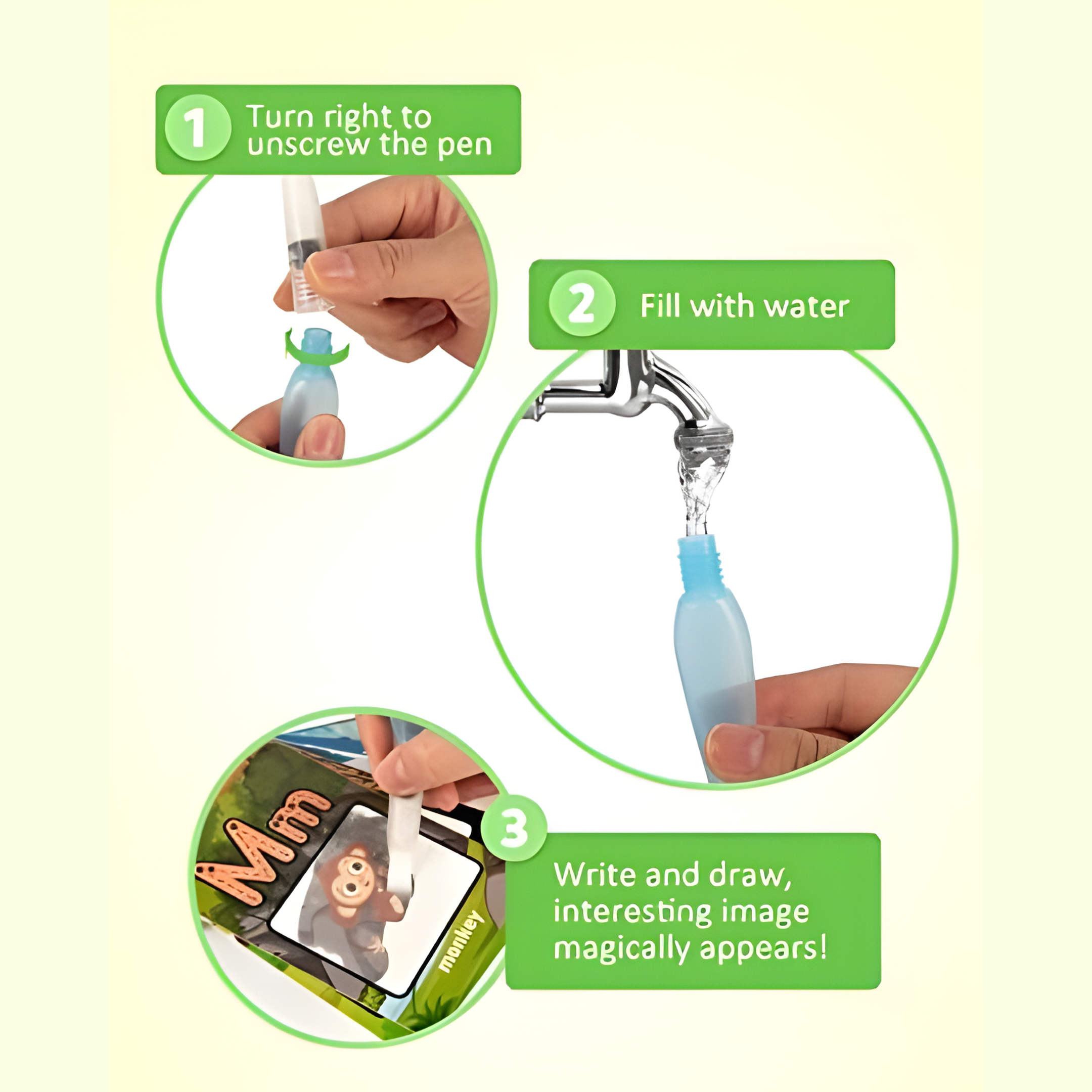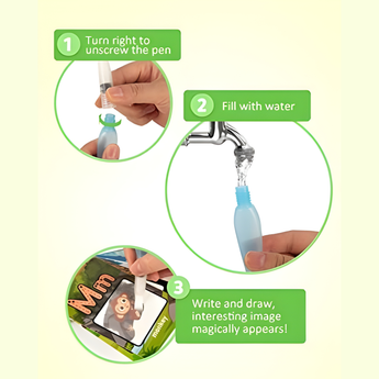 Simply fill the water brush, color on the cards, and watch hidden images appear. Once dry, the pictures fade, ready for another round of play and learning.